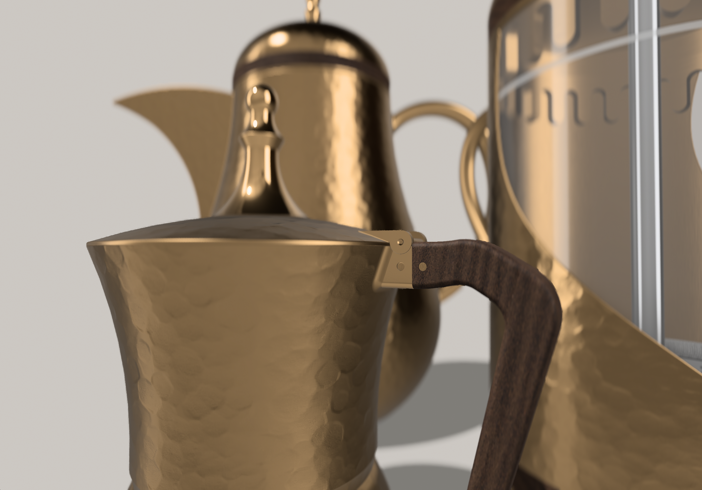 Inspired by the traditional Arabic dallah, the pieces use brass and walnut and rely on an induction hob rather than built-in electronics, combining cultural heritage with functional restraint.