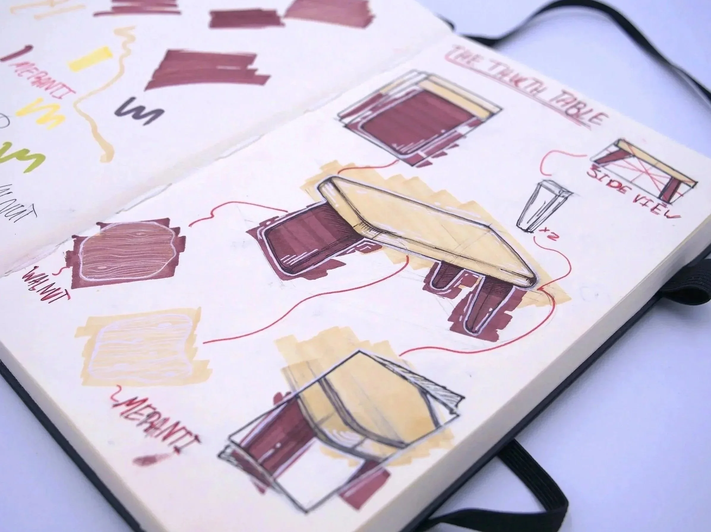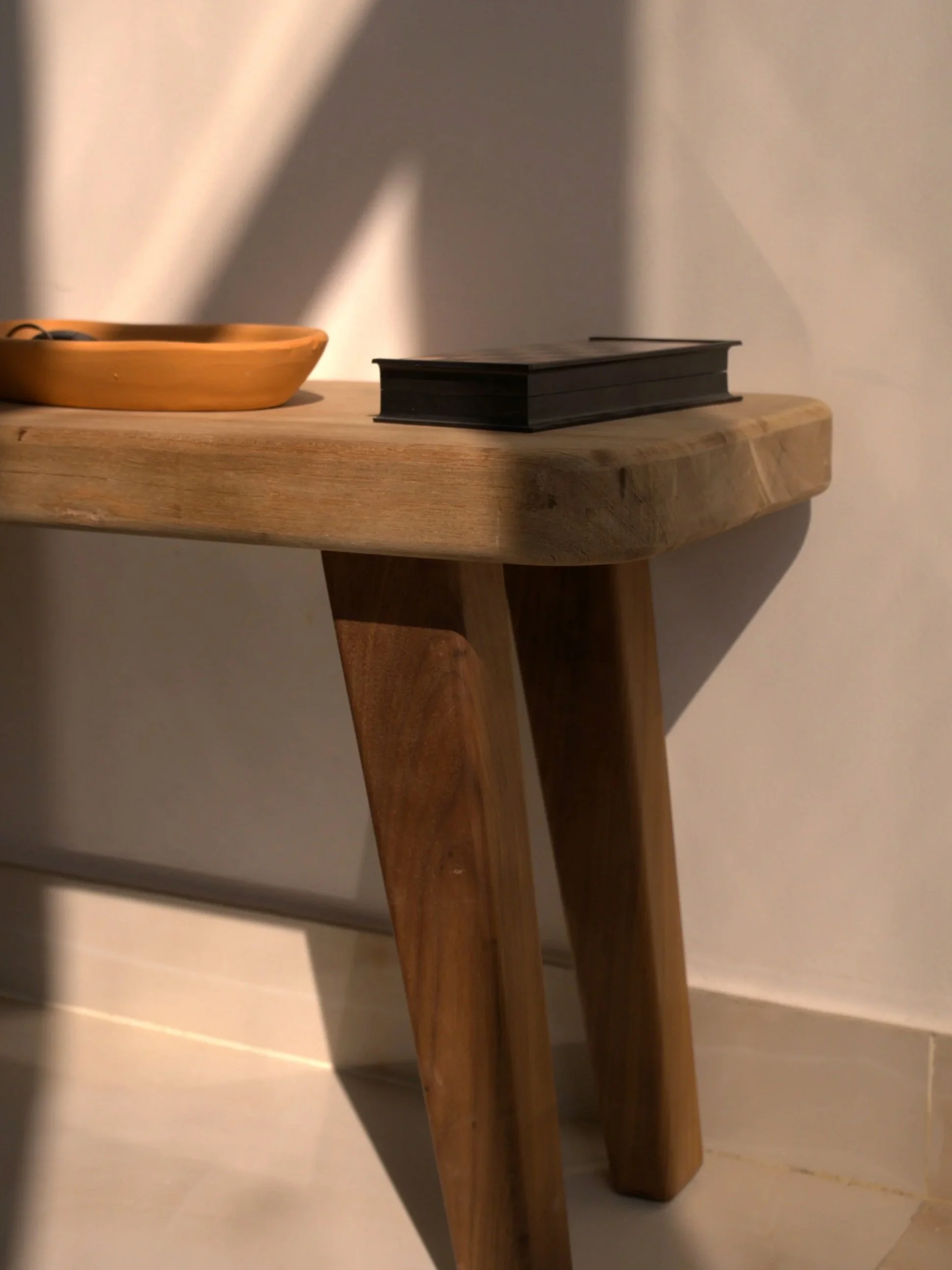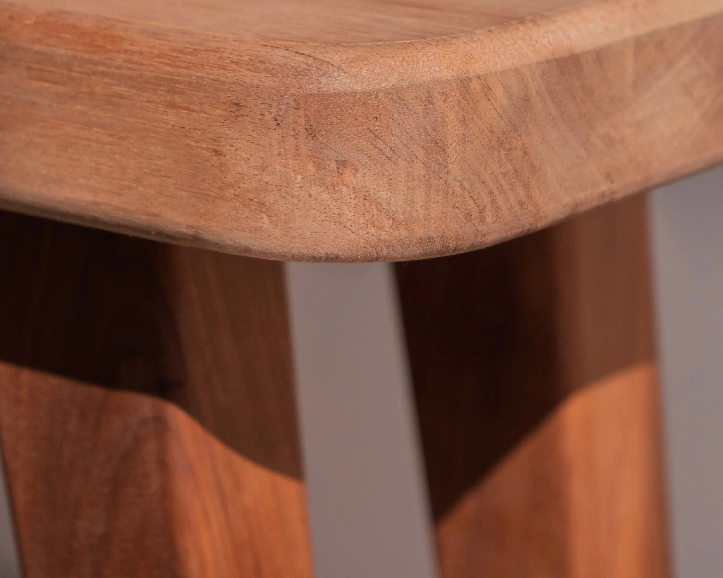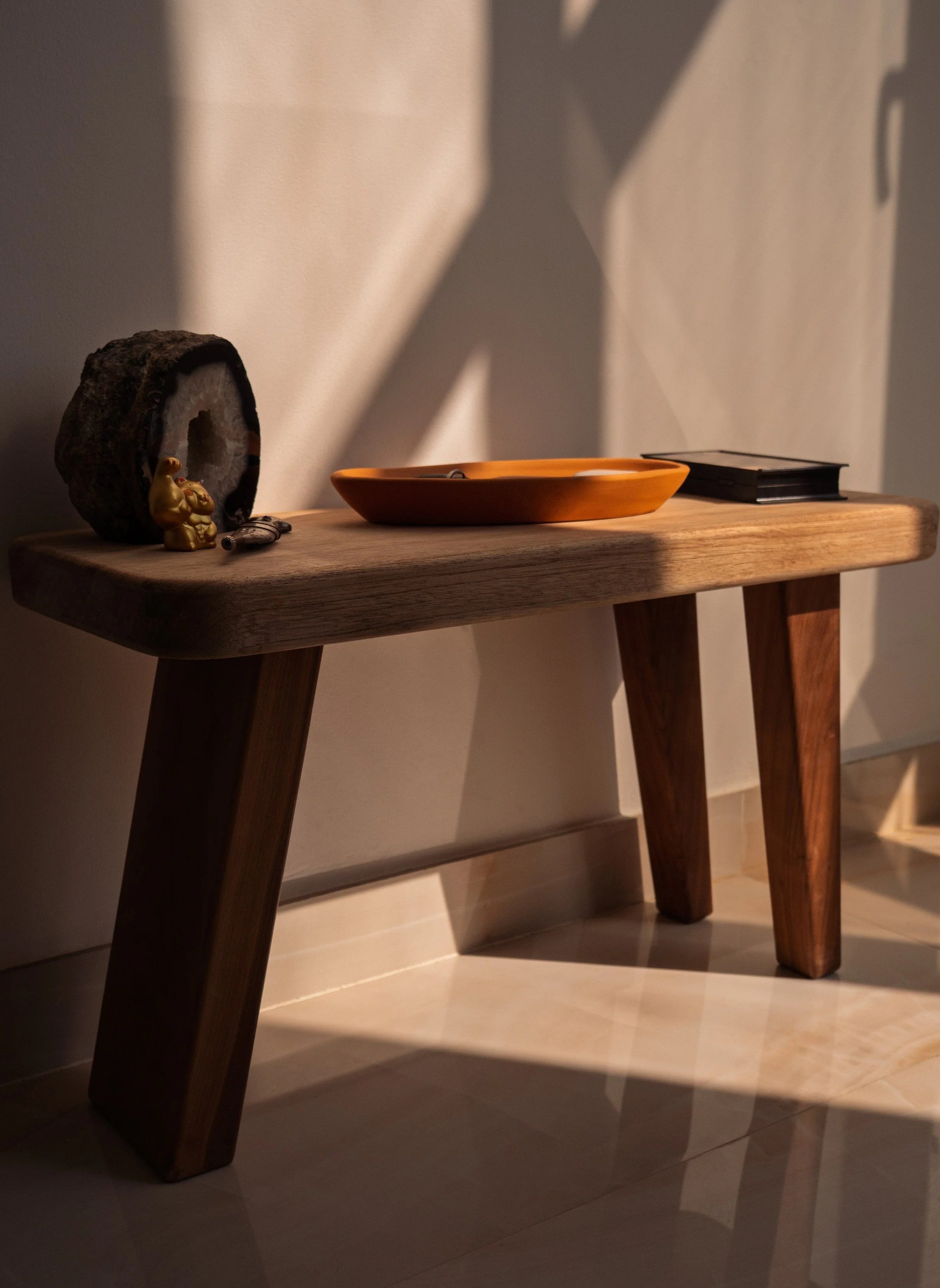 The piece combines red meranti and walnut, exploring proportion, weight, and restraint through contrasting woods.